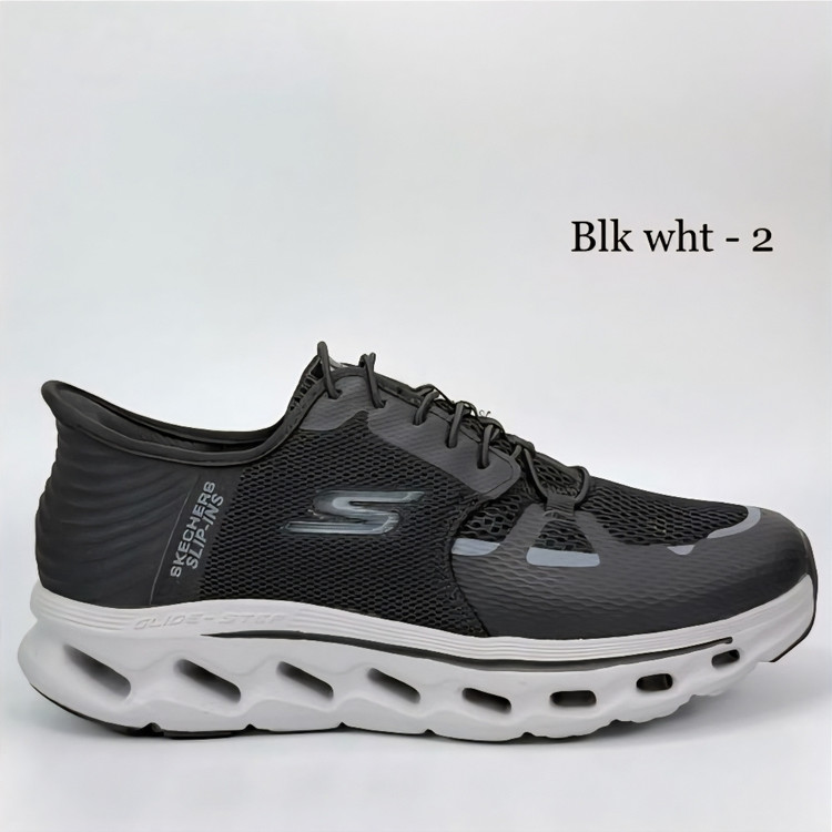 کتونی اسکیچرز مشکی زیره سفید مدل Slip-ins Glide-Step بنددار مناسب پیادهروی شهری و استفاده روزمره
